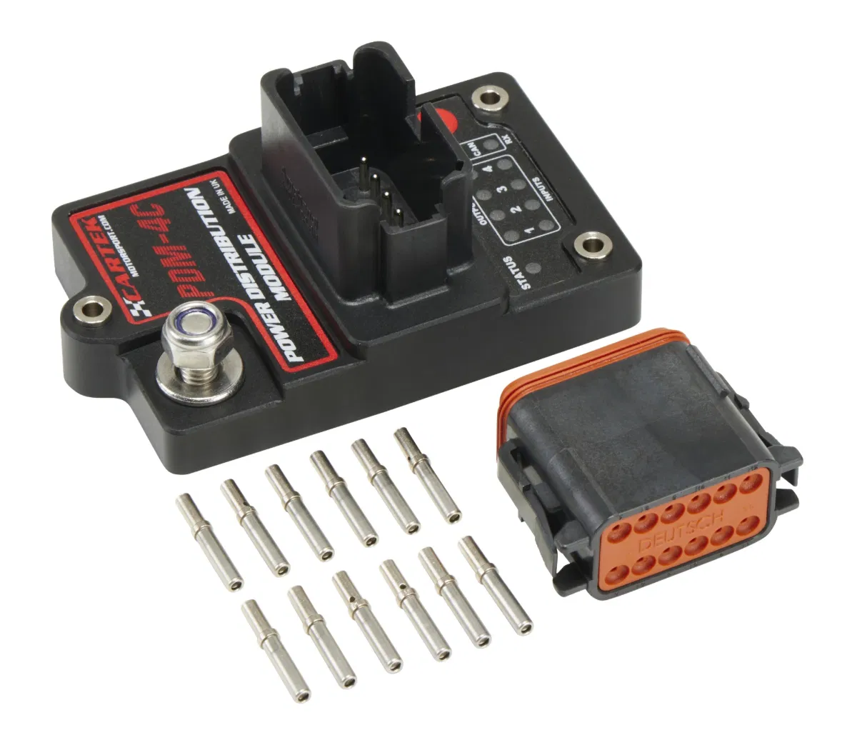 Le PDM-04C possède quatre sorties d’alimentation et une connectivité CAN Bus pour la transmission de données de diagnostic, incluant l’état des sorties, la tension, l’intensité, les paramètres de configuration, etc. Les sorties peuvent également être commandées via le bus CAN.