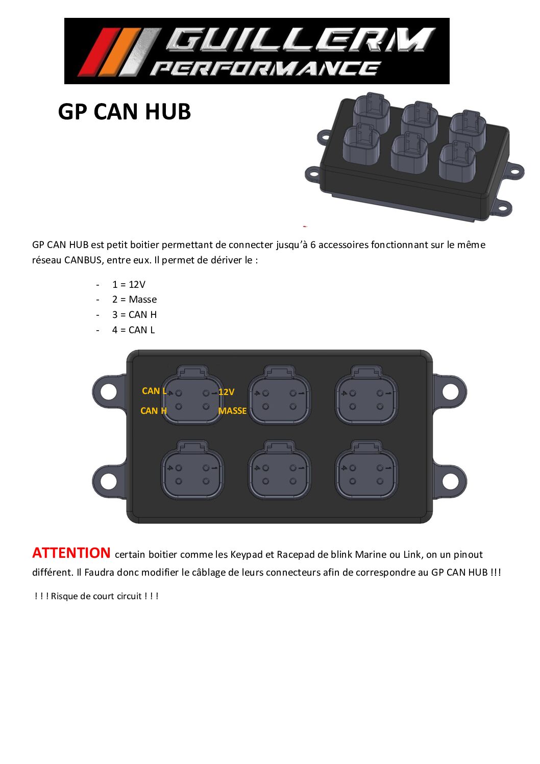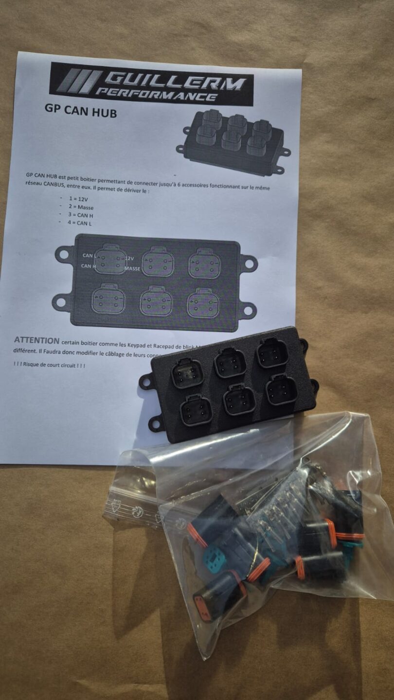 GP CAN HUB est petit boitier permettant de connecter jusqu’à 6 accessoires fonctionnant sur le même réseau CANBUS. Idéal pour connecter ECU, Dashboard, PDM… entre eux. Il permet de dériver le : 12V, Masse, CAN H, CAN L, évitant ainsi les épissures et les risques de défaut dans le réseau Canbus.
